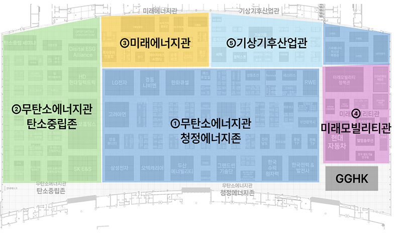 | ①무탄소에너지관(청정에너지존), ②무탄소에너지관(탄소중립존), ③미래에너지관, ④미래모빌리티관, ⑤기상기후산업관 |