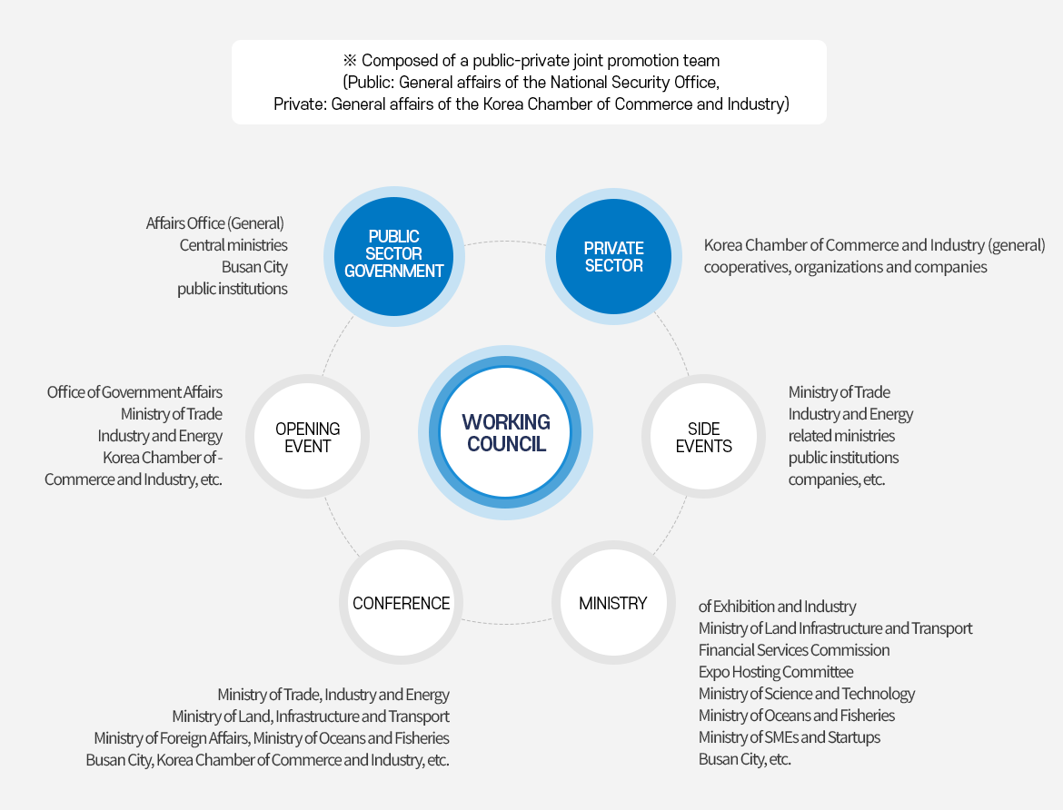 ⑤ (Hosts) 12 ministries including the Ministry of Trade, Industry and Energy, Ministry of Foreign Affairs, Ministry of Environment, Ministry of Land, Infrastructure and Transport, Ministry of Oceans and Fisheries, Ministry of Science and Technology, Ministry of Public Administration and Security, Ministry of SMEs and Startups, Tannok Committee, Financial Services Commission, Expo Hosting Committee, and Busan City